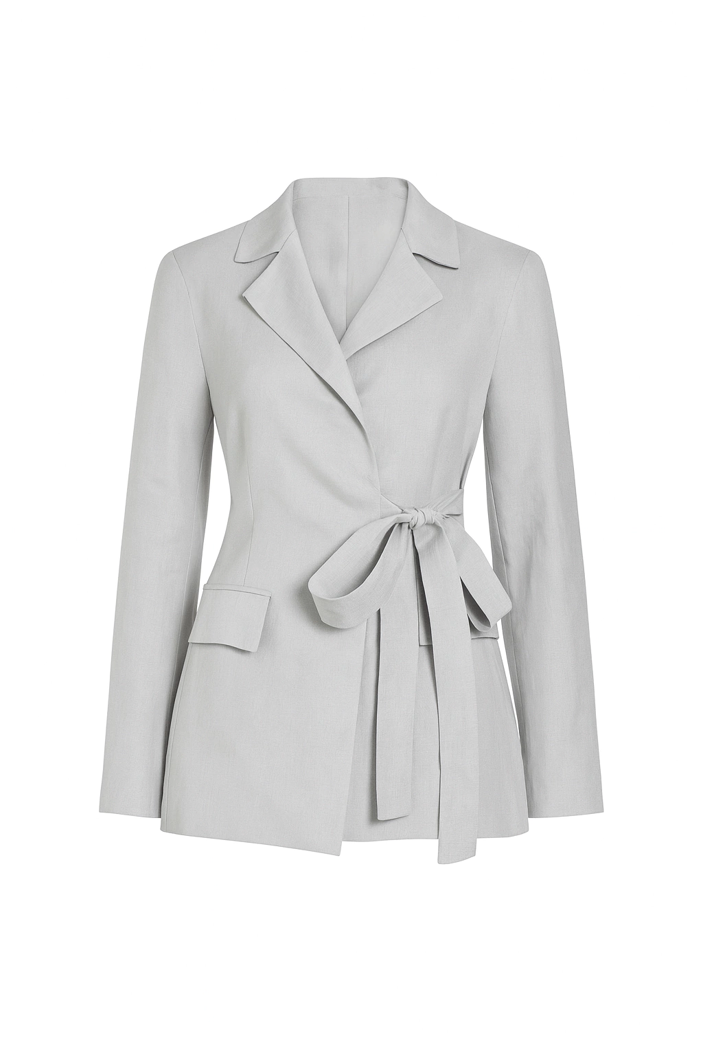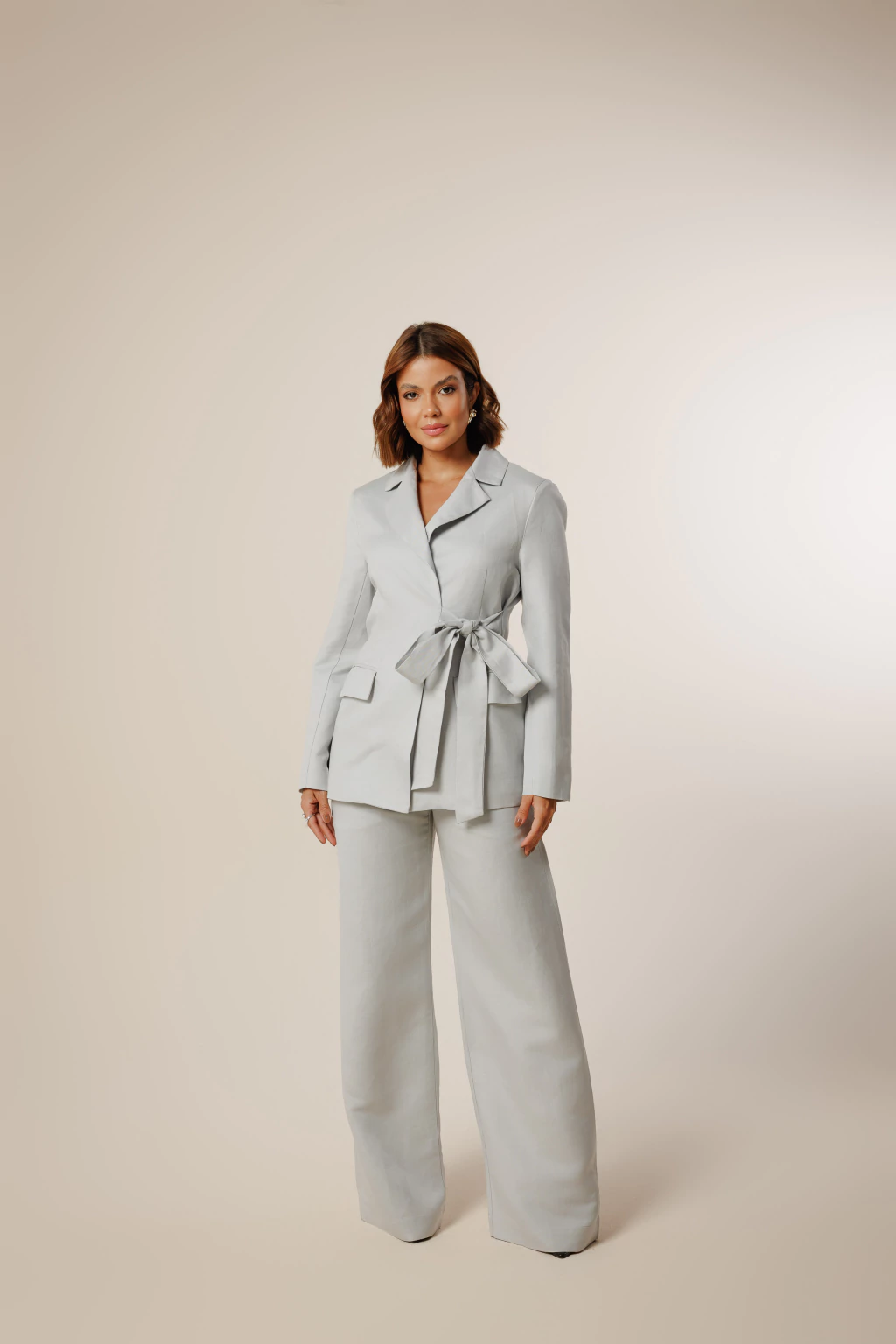 Sua modelagem transpassada permite ajuste lateral com amarração no mesmo tecido, oferecendo um toque de personalidade e versatilidade ao look. Conta ainda com duas lapelas laterais elegantes e fechamento nos punhos por três botões encapados, também revestidos no mesmo tecido, completando um visual refinado e atemporal.