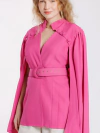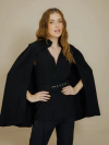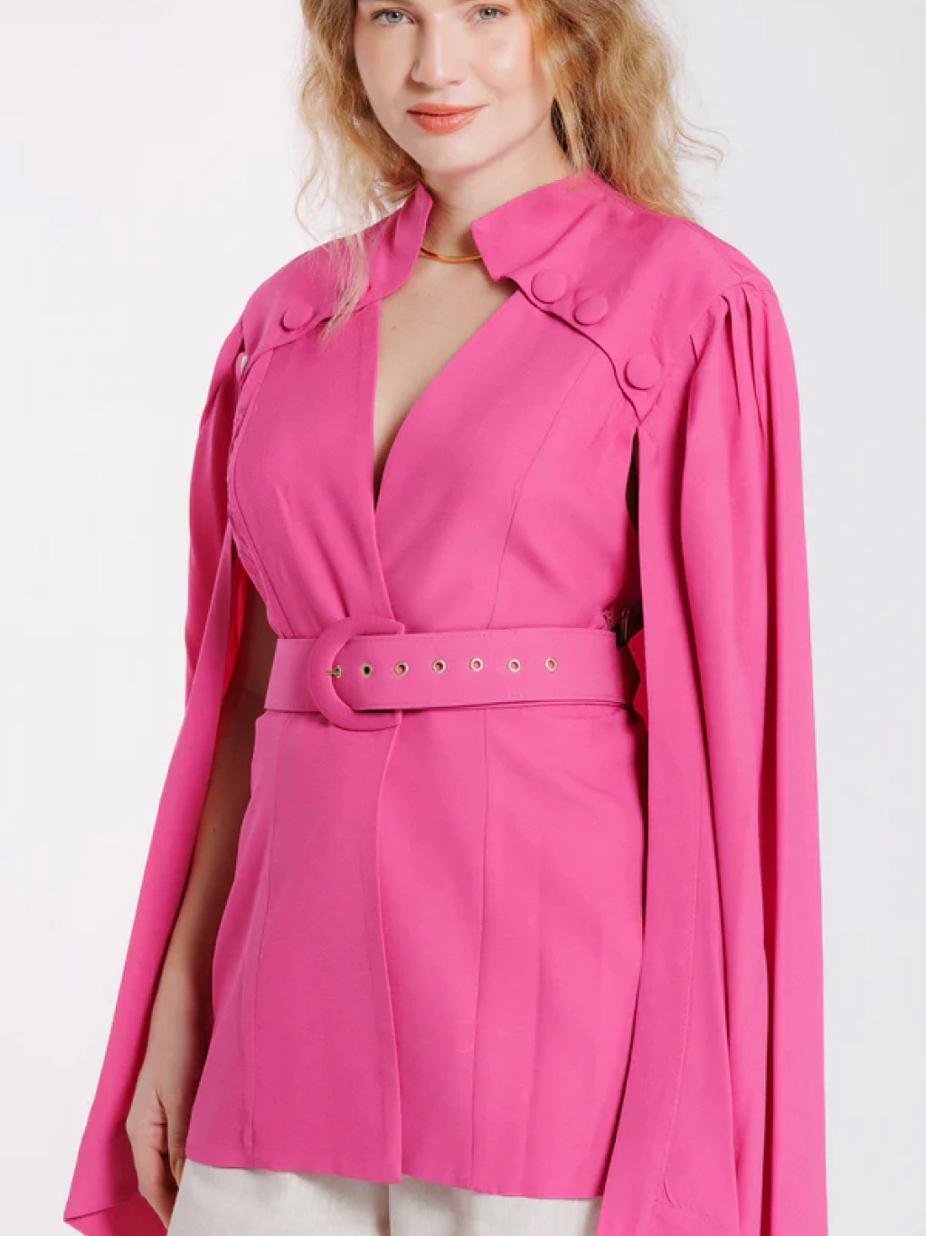 O Blazer Maria Capa possui capa que cobre as costas e parte dos braços, deixando os braços livres. Possui ombreiras e botões forrados como detalhe nos ombros.