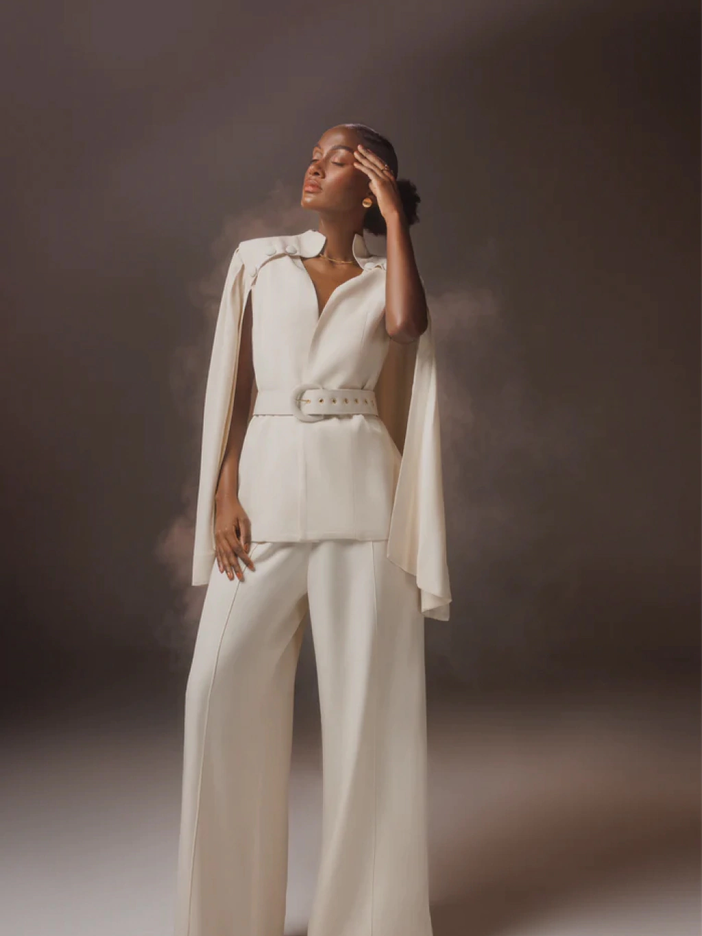 Possui fecho para fechamento na altura da cintura e acompanha cinto com fivela revestida no próprio tecido, seu tecido é um crepe sob medida à base de viscose que permite um caimento leve.