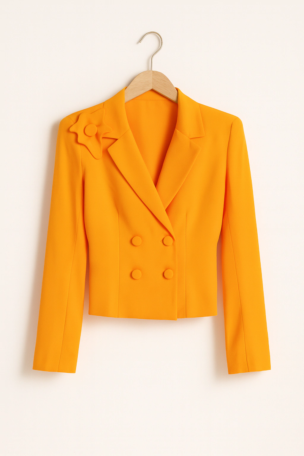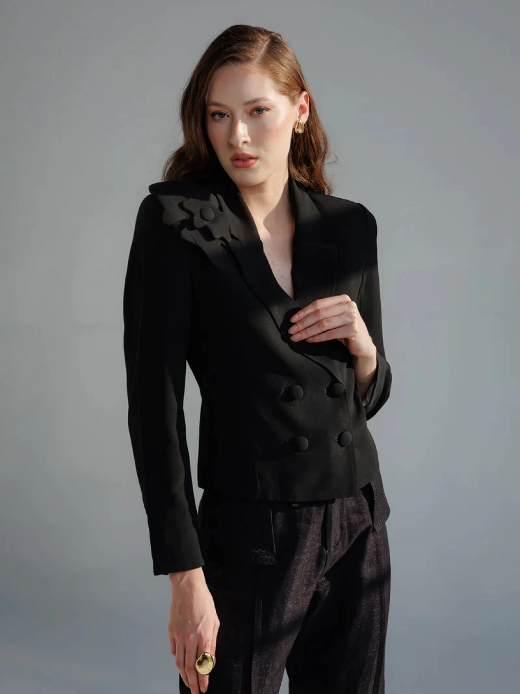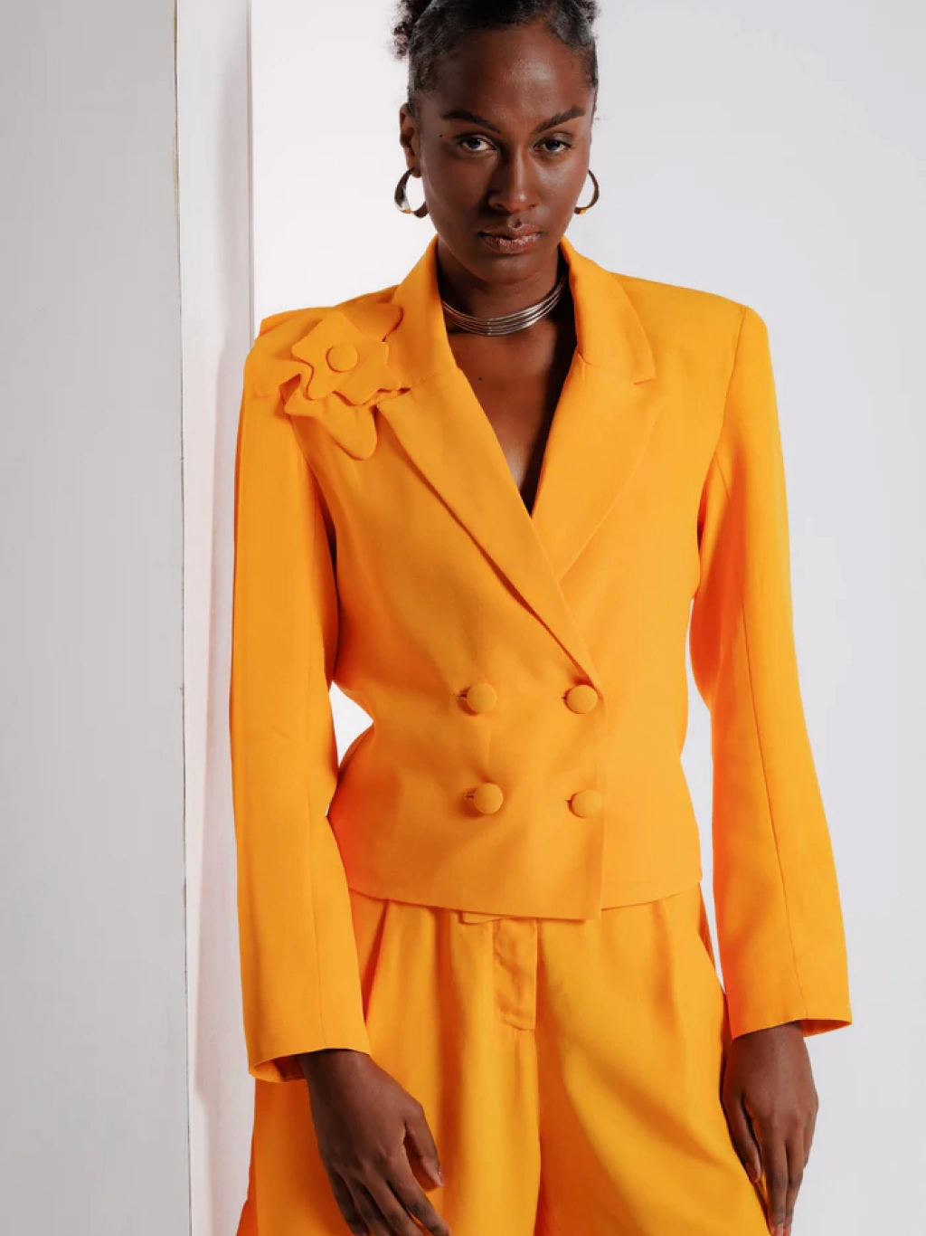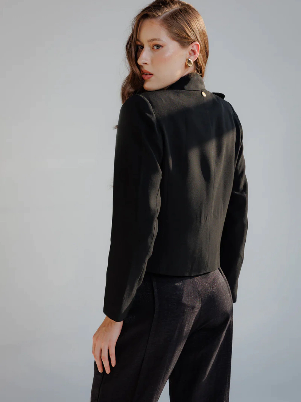 O Blazer Noemi possui comprimento cropped, modelagem alongada e seca. A abotoadura trespassada com 4 botões forrados na frente traz o ar clássico e atemporal da peça.
