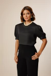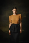 Suas mangas bufantes, com ombreiras internas no mesmo tecido, adicionam um toque de imponência feminina, enquanto os punhos largos reforçam o acabamento refinado. O decote das costas conta com abertura delicada e fechamento por botão encapado, criando um detalhe discreto de charme e modernidade.