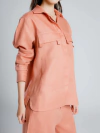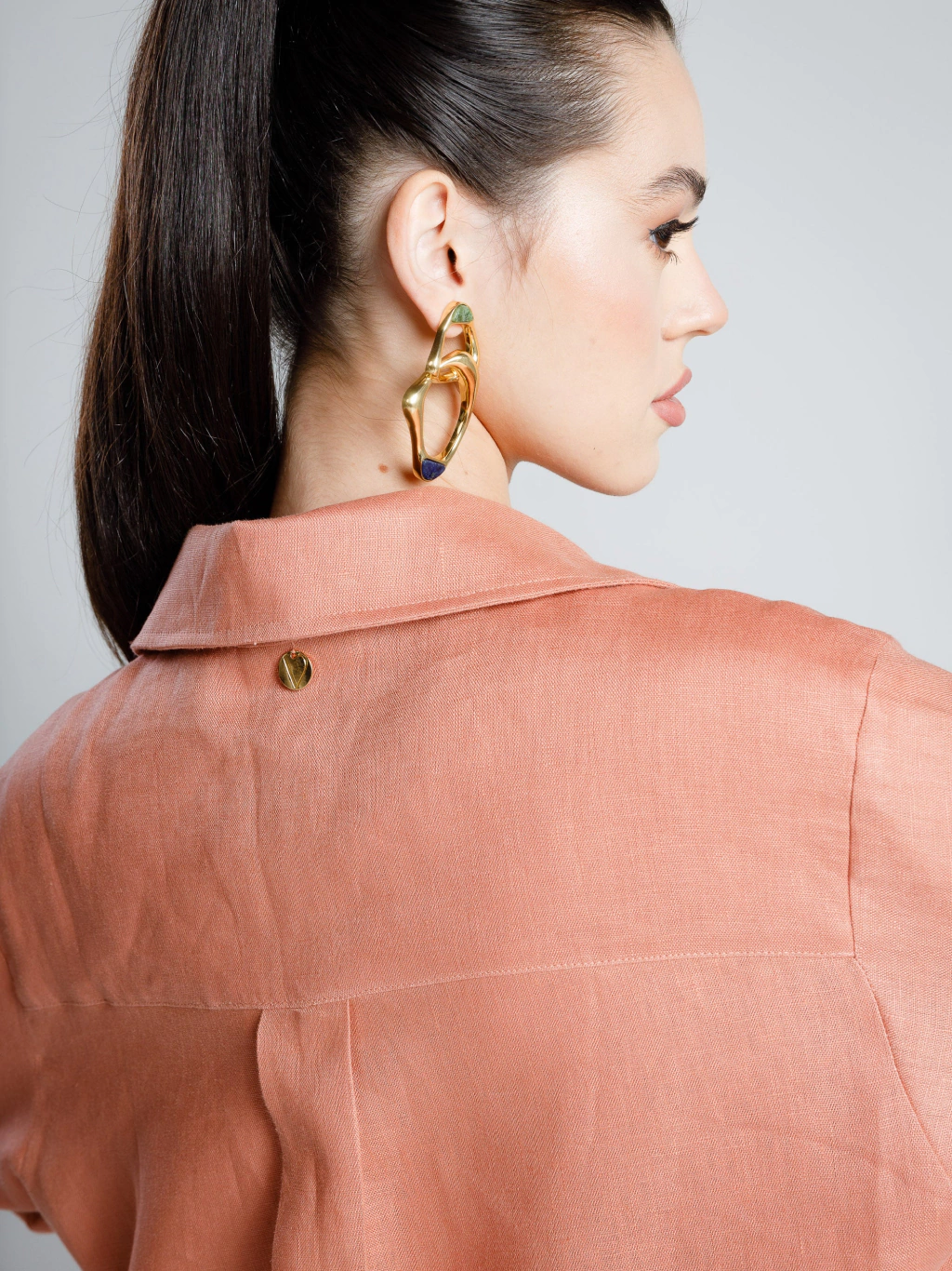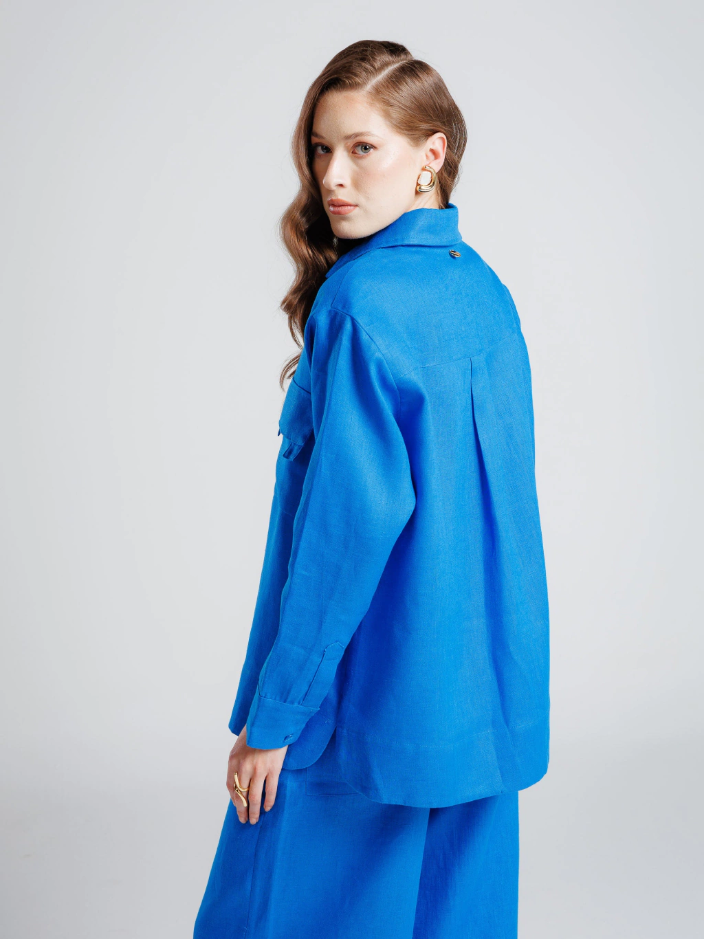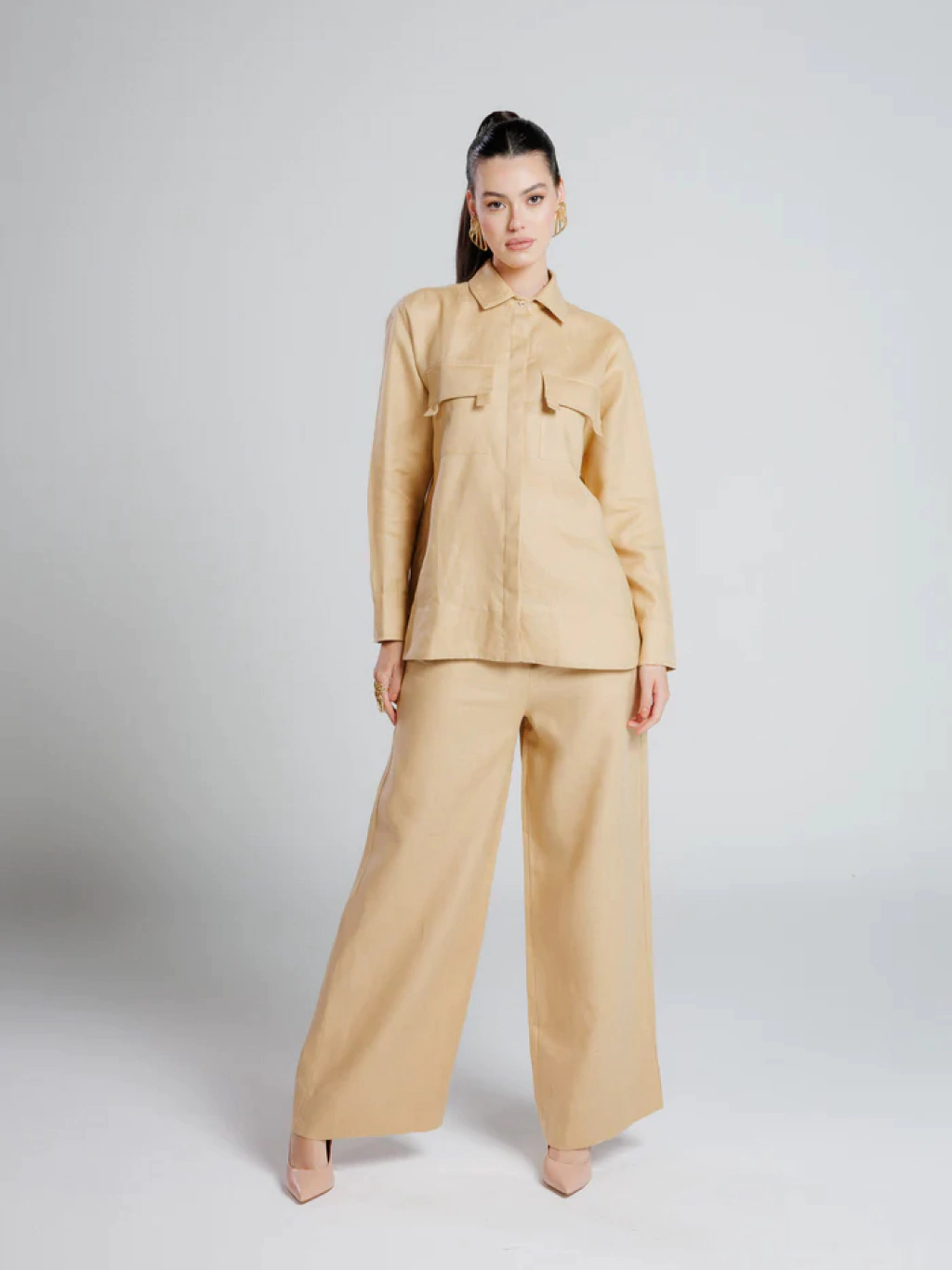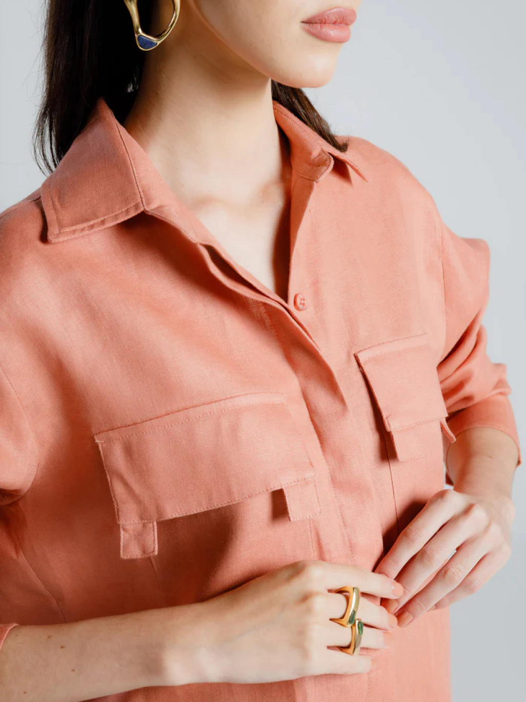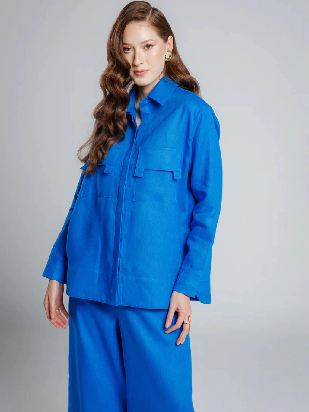 A modelagem oversized, os bolsos utilitários e a barra arredondada com fendas nas laterais, são elementos do universo esportivo que compõe perfeitamente com a nobreza do linho.