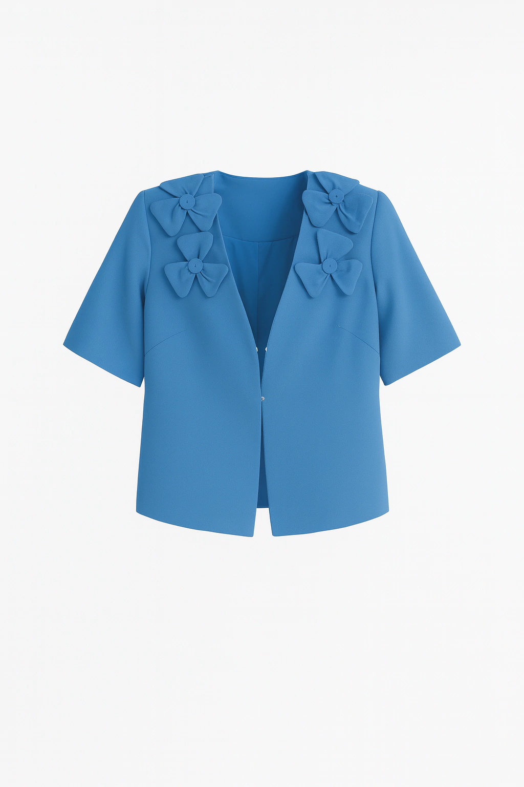 O destaque da peça está nas flores dos ombros que são feitas de forma 100% manual, com botões encapados no mesmo tecido.