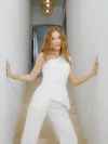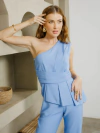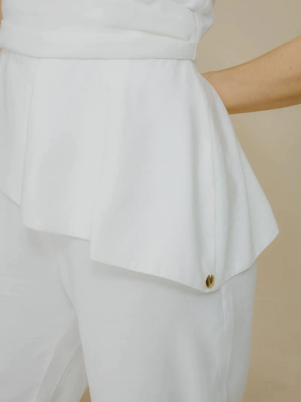 Detalhe lateral em peplum pregueado e martingale na barra com botão encapado no mesmo tecido.