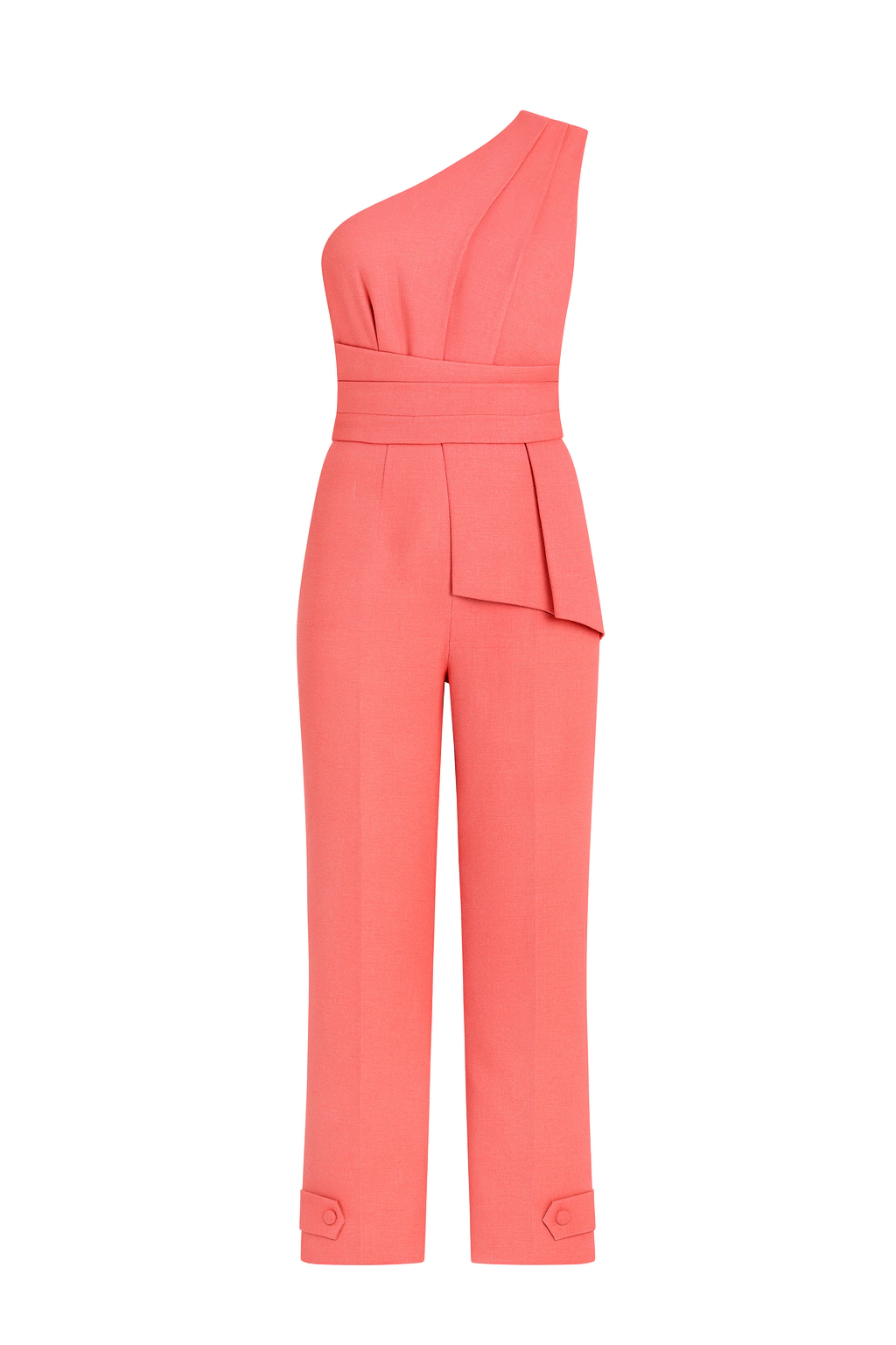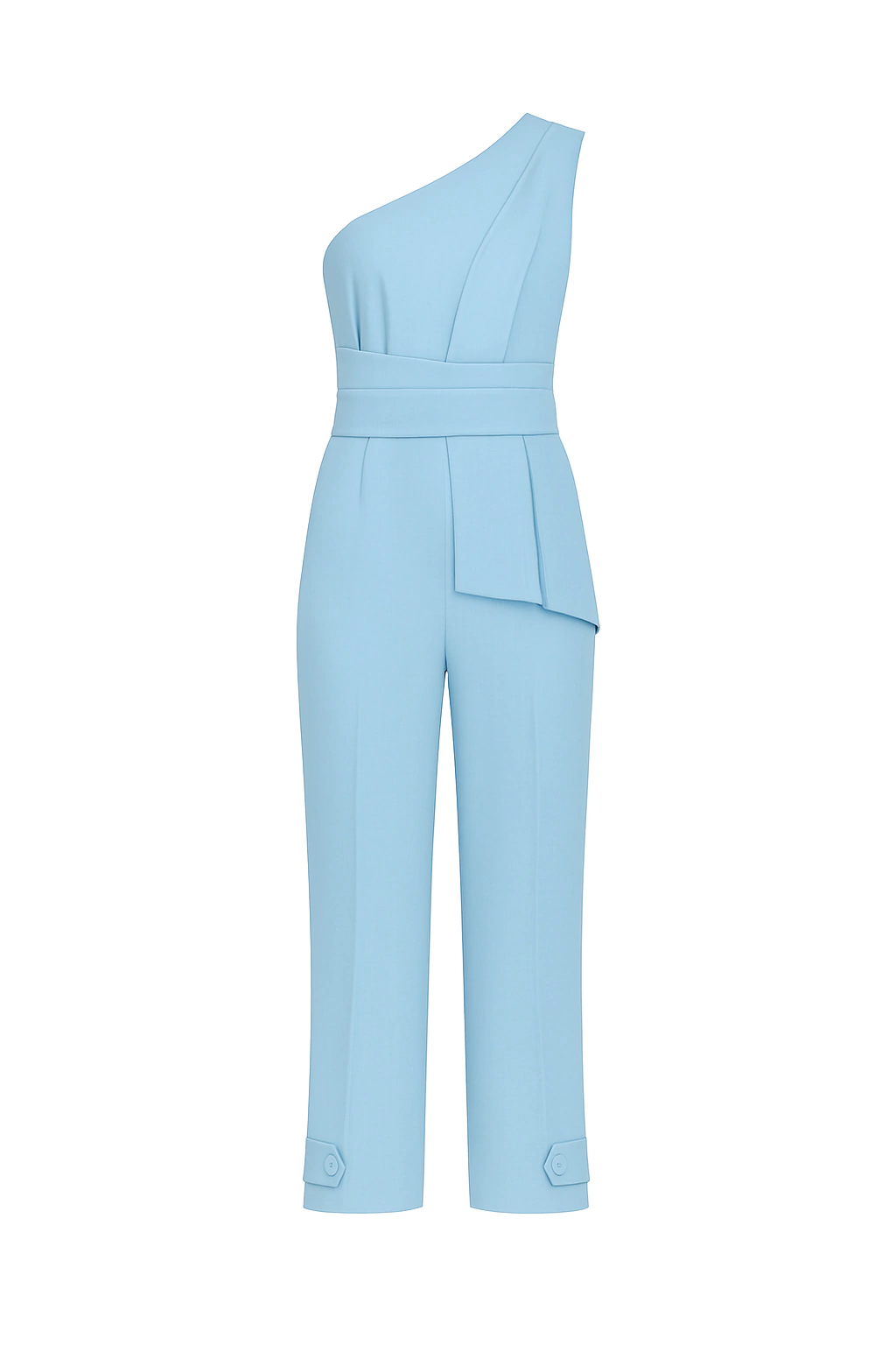Macacão nula manga com pregas que saem do ombro e pala na cintura em tomas.