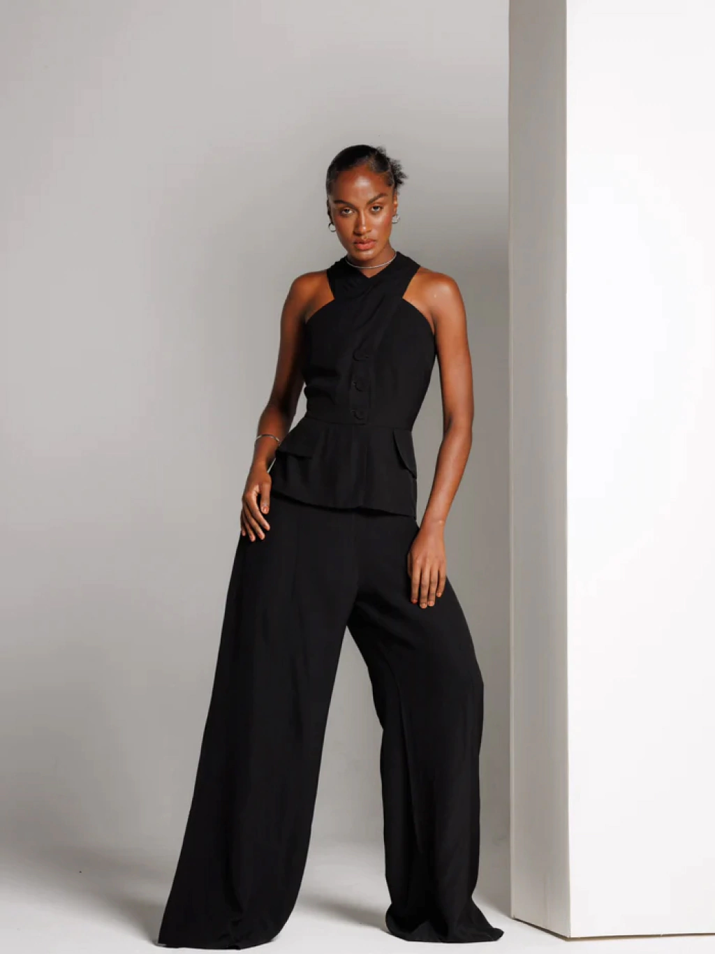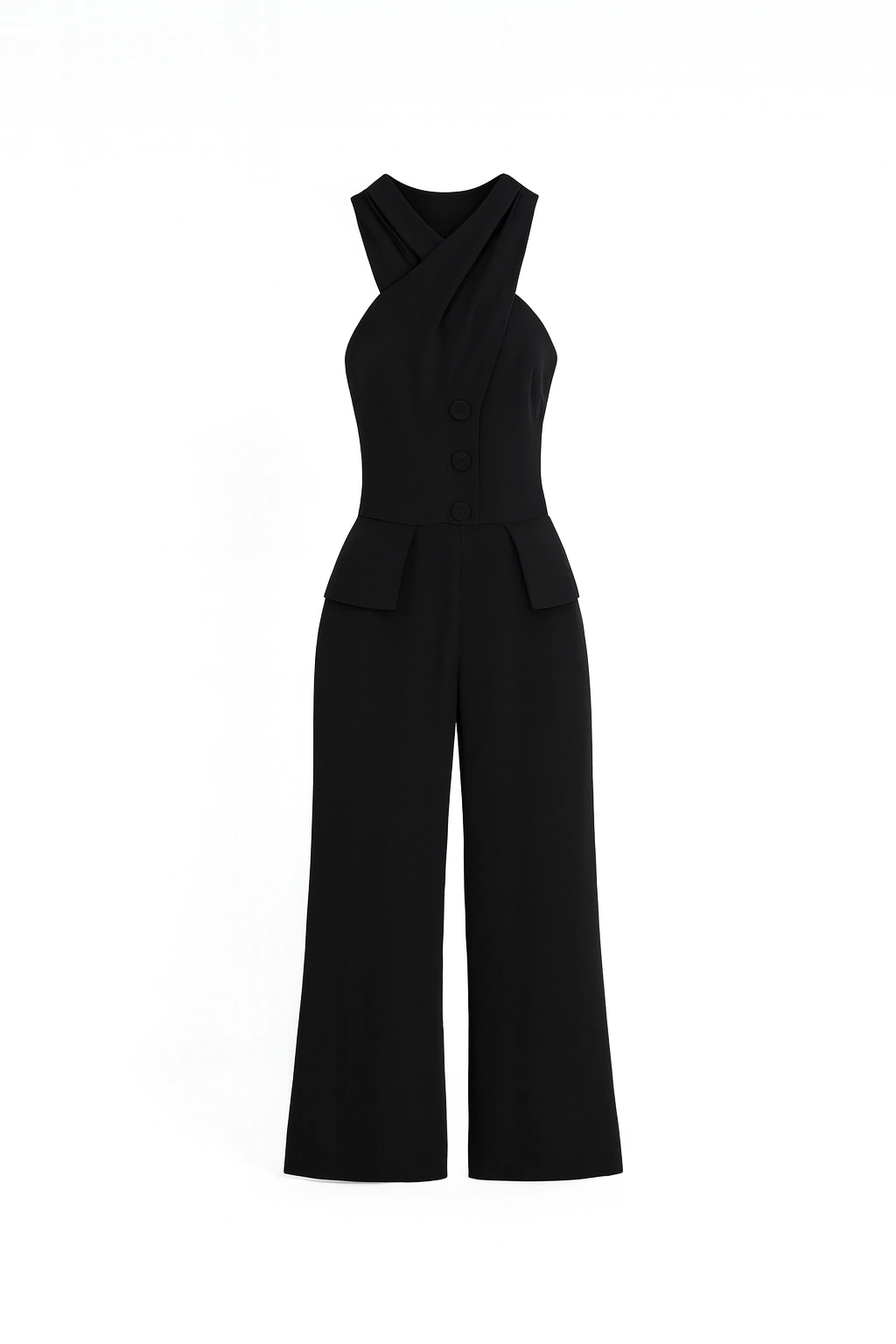 O fechamento é feito com zíper nas costas. O detalhe de sobreposição na frente transmite a ideia de conjunto de blusa e calça, e as pernas largas com canelado reforçam o efeito alongador do macacão.
